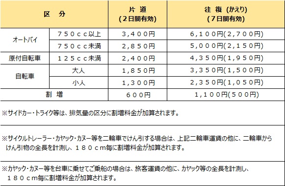 - 海上荒天時には乗船制限がございます。お車は台数制限・高荷制限、二輪車は台数制限・大きさ制限がございますのでご了承下さい。