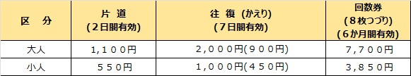 (例)大人の場合→ゆき1,100円+かえり900円=往復運賃2,000円
